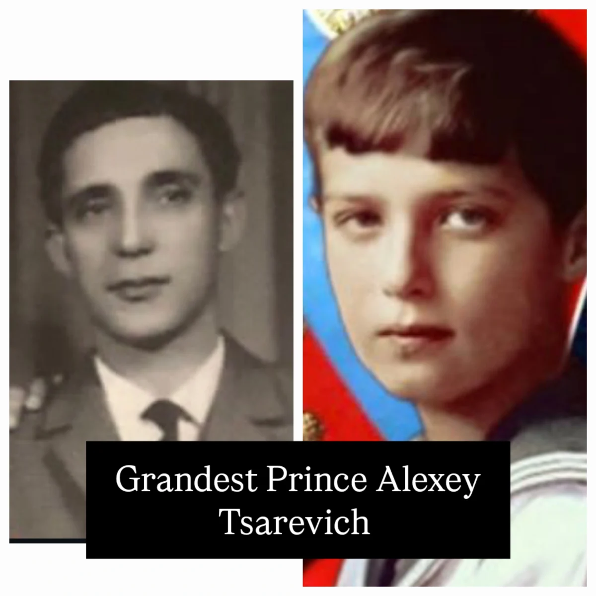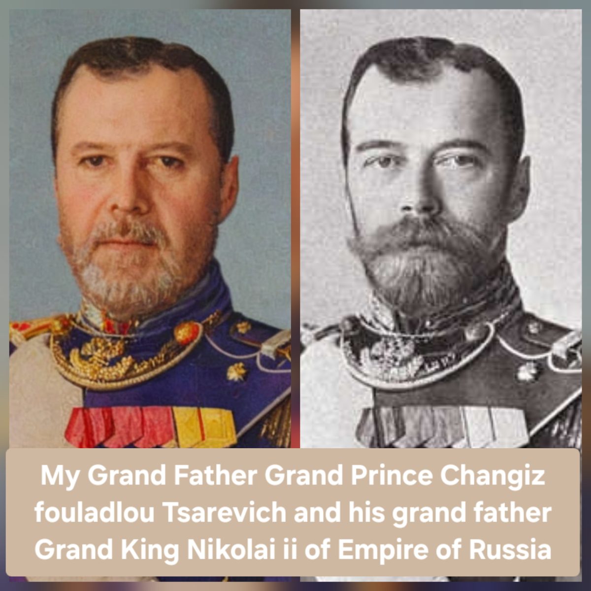 THIS IS THE COLLEGED PHOTO OF GRAND KING NIKOLAI II TSAREVICH AND HIS GRAND SON GRAND PRINCE CHANGIZ, this photo is made with swap website to determine the strong similarty between father Nikolai ii the grand king and his grand son grand prince changiz